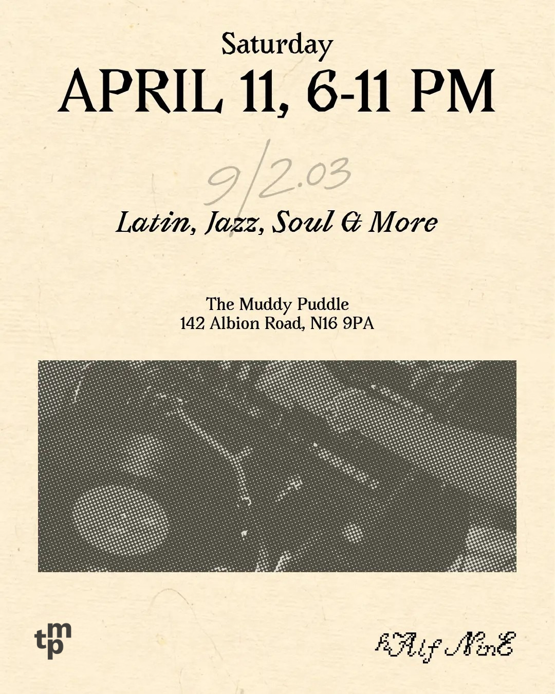 9/2.03, the third edition of Half Nine. a vinyl-focused night at The Muddy Puddle in London. Expect soul, latin, jazz, funk, dub and more. Small room, good sound, unique drinks menu.